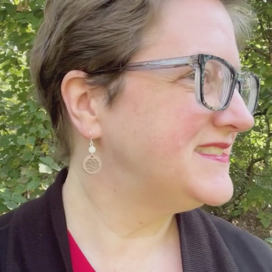 These elegant, swingy earrings combine 3 natural materials into one lovely pair of earrings. The darker brown of the natural Mahogany contrasts with the shimmery white of the mother of pearl beads, and the sterling silver findings tie it all together. Add in the stylized rose cutout in the mahogany, and you have jewelry that goes from work to an evening out with ease. Even with the beads, they still remain remarkably lightweight, so you avoid the pain that comes with wearing heavier earrings.