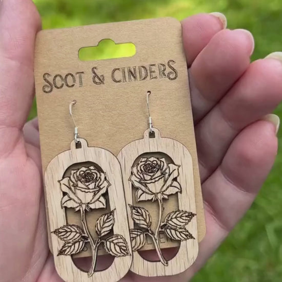 These Stem-sational earrings feature a delicate long-stemmed rose design, laser-engraved on both sides of sustainably sourced Red Oak wood.
